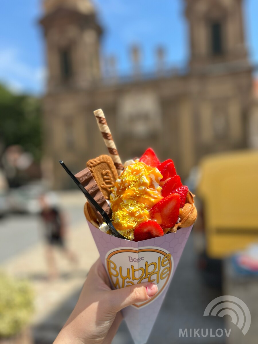 Okénko Paninka Bubblewaffle nabízí čerstvé sladké i slané bubble waffles připravované na místě.